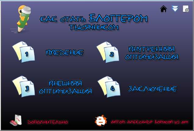 Третья глава «внешняя оптимизация» поможет вам в выводе нужных вам поисковых запросов в лидеры поисковой выдачи при минимальных затратах, получение ссылочной массы, как платными так и бесплатными способами для повышения пузомерок блога. Ведь даже если вы имеете солидный бюджет на продвижение сайта, то вы не застрахованы в успешной компании по продвижению, потому что все надо делать с умом и вкладывать не только денежные массы, но и ум с опытом. А компенсировать отсутствие опыта вам сможет данный видео курс — как стать блоггером тысячником.