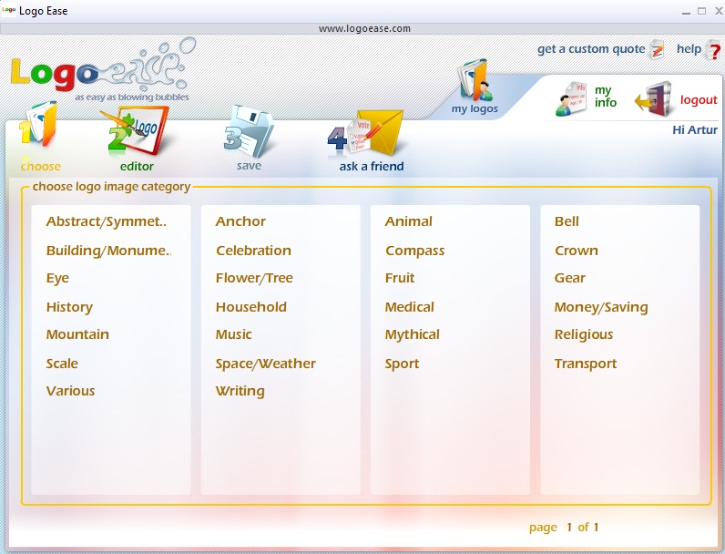 В появившимся новом окне нам предлагают выбрать рисунок для логотипа из представленных тем. На сайте имеются следующие темы: abstract/symmetry, building/monument, eye, history, mountain, scale, various, anchor, celebration, flower/tree, household, music, space/weather, writting, animal, compass, fruit, medical, mythical, sport, bell, crown, gear, money/saving, religious, transport.