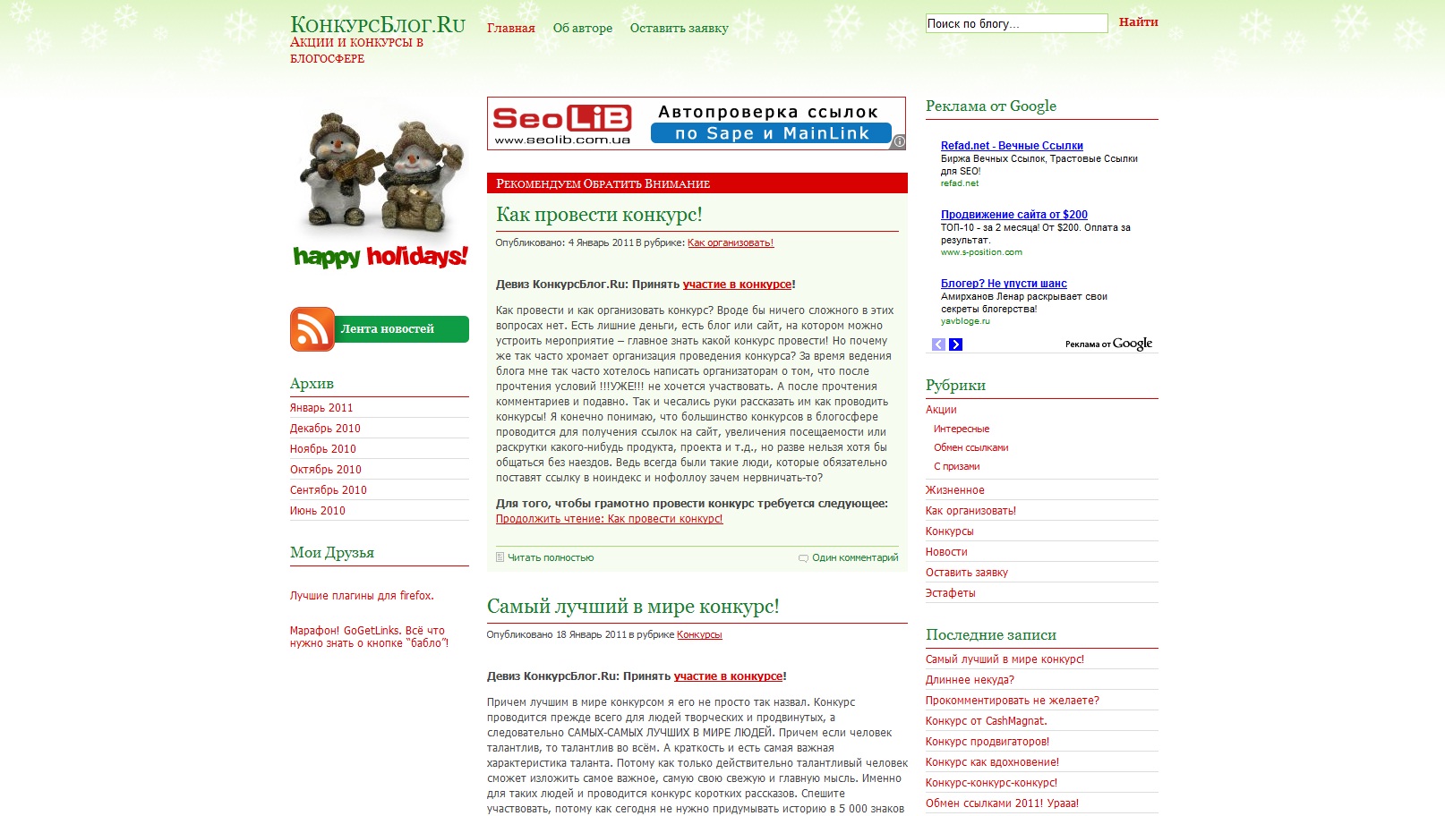 На данный момент дизайн в стиле минимализма, без нагромождений. Салатовый фон, перетыкаемый в белый с элементами снежинок подходит под время года, плюс снеговики с поздравлением хорошо смотрятся. Интересно будет посмотреть на блог в другое время блога.