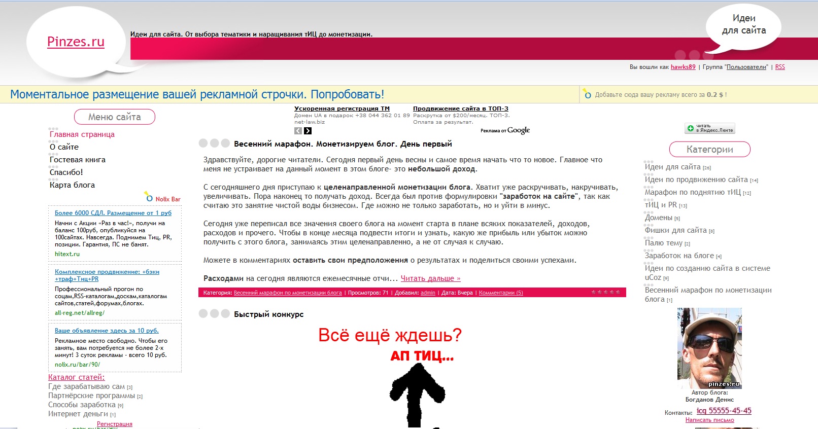 Первым на очереди идет блог Богданова Дениса про идеи для сайта, от выбора тематики и наращивания ТИЦ до монетизации. Блог Дениса я читаю давно, почти с самого начала создания своего блога, так как я принимал участие в его марафоне по поднятию ТИЦ и победил.