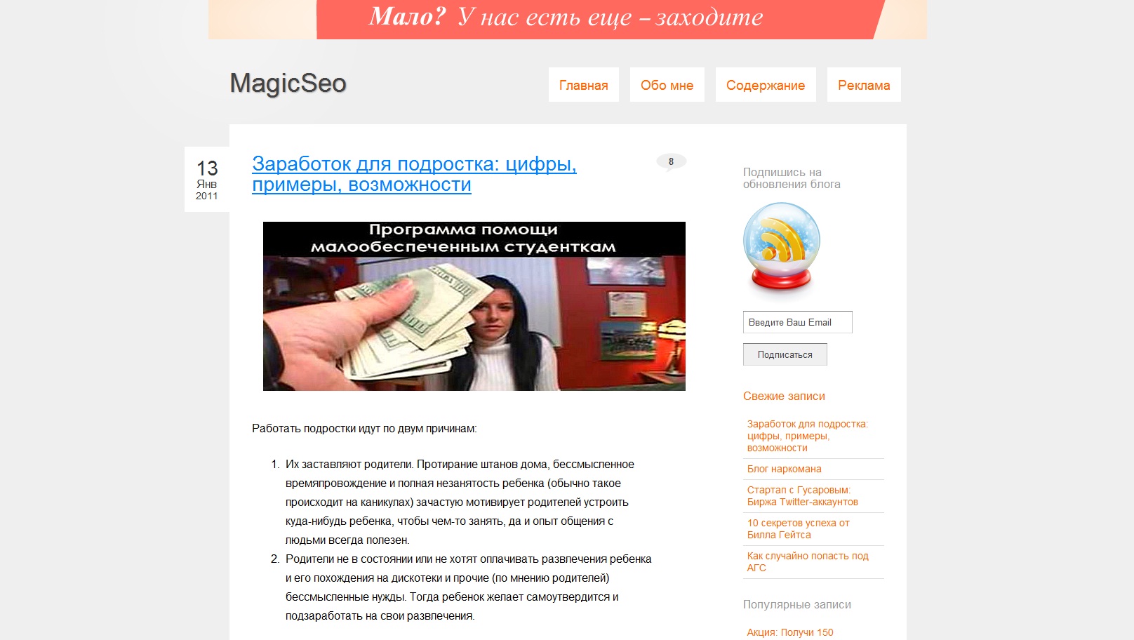 Автор пишет на интересные темы, при этом довольно часто раз в два-три дня. Очень понравилась рубрика – эксперименты, особенно статьи по получению трафика на блог с помощью изображений.
