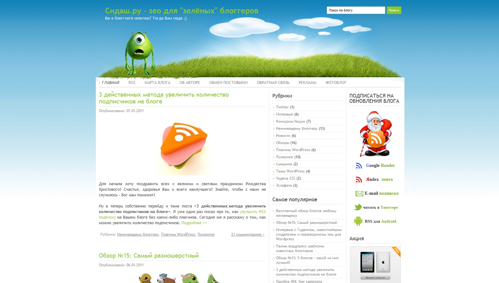 Красиво сделанная шапка дала толчок к полной переделки оформления под зеленый цвет, так же монстрик с шапки Дмитрий использует в аватаре при комментировании в других блогах, тем самым наращивает целевую аудиторию и улучшает свой бренд.