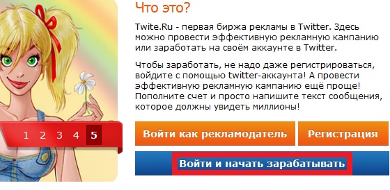 Если решили попробовать заработать с данной биржей, тогда вам надо первым делом зайти на сайт twite.ru и в правом верхнем углу выбираем вариант «войти и начать зарабатывать», как показано на рисунке.