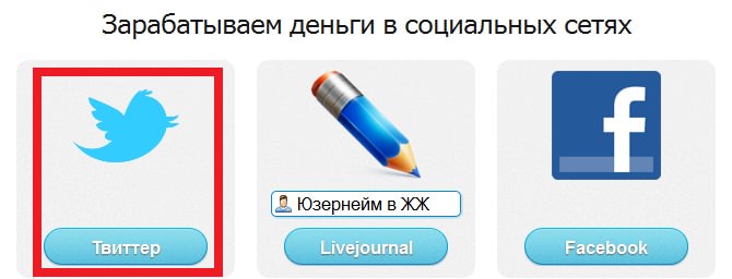 Теперь в зависимости от ваших возможностей выбираете способ заработка, это либо при помощи сервиса twitter, живого журнала (Livejournal) или аккаунта в facebook. После выбора блогерской площадки необходимо или зарегистрироваться либо авторизироваться через выбранную платформу.
