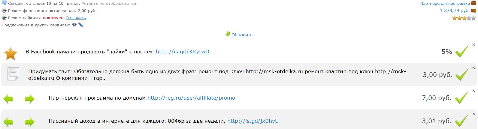 Сервис интуитивно понятен, поэтому на примере твиттера и расскажу, как можно зарабатывать на нем. После того как вы выбрали способ при помощи твиттера и авторизировлись перед вами появится следующее окно с предложениями о размещение рекламного твита.