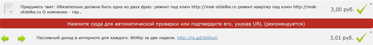 Заработать с твайт очень просто, для этого необходимо напротив рекламного объявления кликнуть на «зеленую галочку», после чего откроется твиттер с написанным в нем рекламном сообщением и вам надо будет только подтвердить публикацию сообщения. После, рекомендую секунд через 5-10 кликнуть на «нажмите сюда для автоматической проверки…», чтобы рекламное сообщение засчитывалось, и деньги перешли на ваш счет или в противном случае необходимо вручную указать адрес рекламного сообщения.
