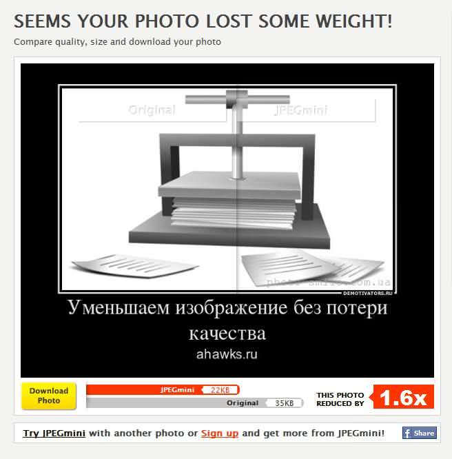Как видно на рисунке, вставленное выше изображение я прогнал через этот же сайт и сократил вес его практически в два раза, что вполне неплохой результат.