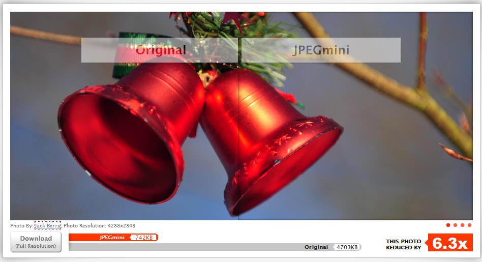 После этого на новой странице нажимаем на кнопку «Select Photos», после этого находим нужную нам картинку, которую загружаем на сайт, после чего сервис в онлайн режиме сжимает размер изображения фактически без снижения качества. Как видно из рисунка снизу мы можем увидеть, насколько снизился размер рисунка, а с помощью мышки можно передвигать прозрачный ползунок, который слева отображает оригинальное изображение, а справа полученное после оптимизации.
