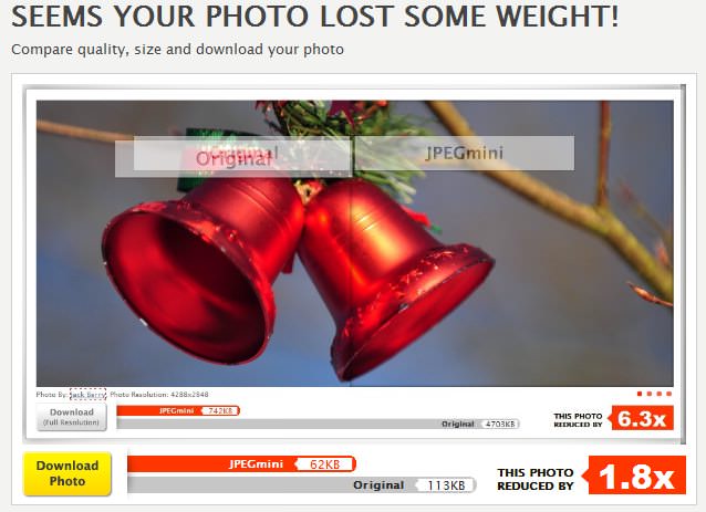 На замену мне попался другой полезный сайт jpegmini.com, который не имеет ограничения на вес загрузки изображений, а в некоторых случаях эффект достигает многократное сжатие, о чем можно увидеть на стартовой странице сервиса. Большие профессиональные фотки сжимает в 5-6 раз, если брать обычные изображения, то и тут можно значительно сократить размер изображения.