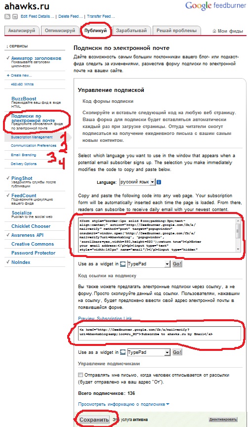 Зайдя на сервис, вы выбираете нужный вам сайт и после кликаете на вкладку – публикуй — подписки по электронной почте. На изображении я отметил ключевые места, куда надо кликать, надеюсь, мое кривое подчеркивание вы простите. Слева на изображении я пронумеровал 4 вкладки по настройки емеил подписки, пойдем по порядку.