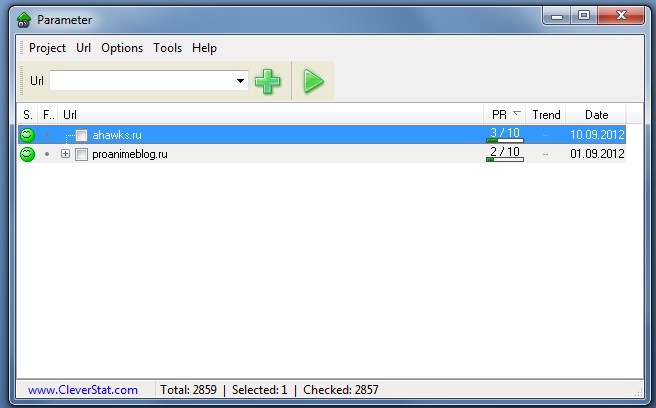 Как это работает. Для начала запускаем программу PaRaMeter. Как видно интерфейс программы простой и все интуитивно понятно. Если хотите просто определить PageRank сайта, то вписываете урл нужного вам сайта и нажимаете на зеленый плюс. После того как составили список сайтов, которые вы хотите проанализировать на гугловскую пузомерку, просто нажимаете на ленную стрелочку и программа выдает нужный результат.