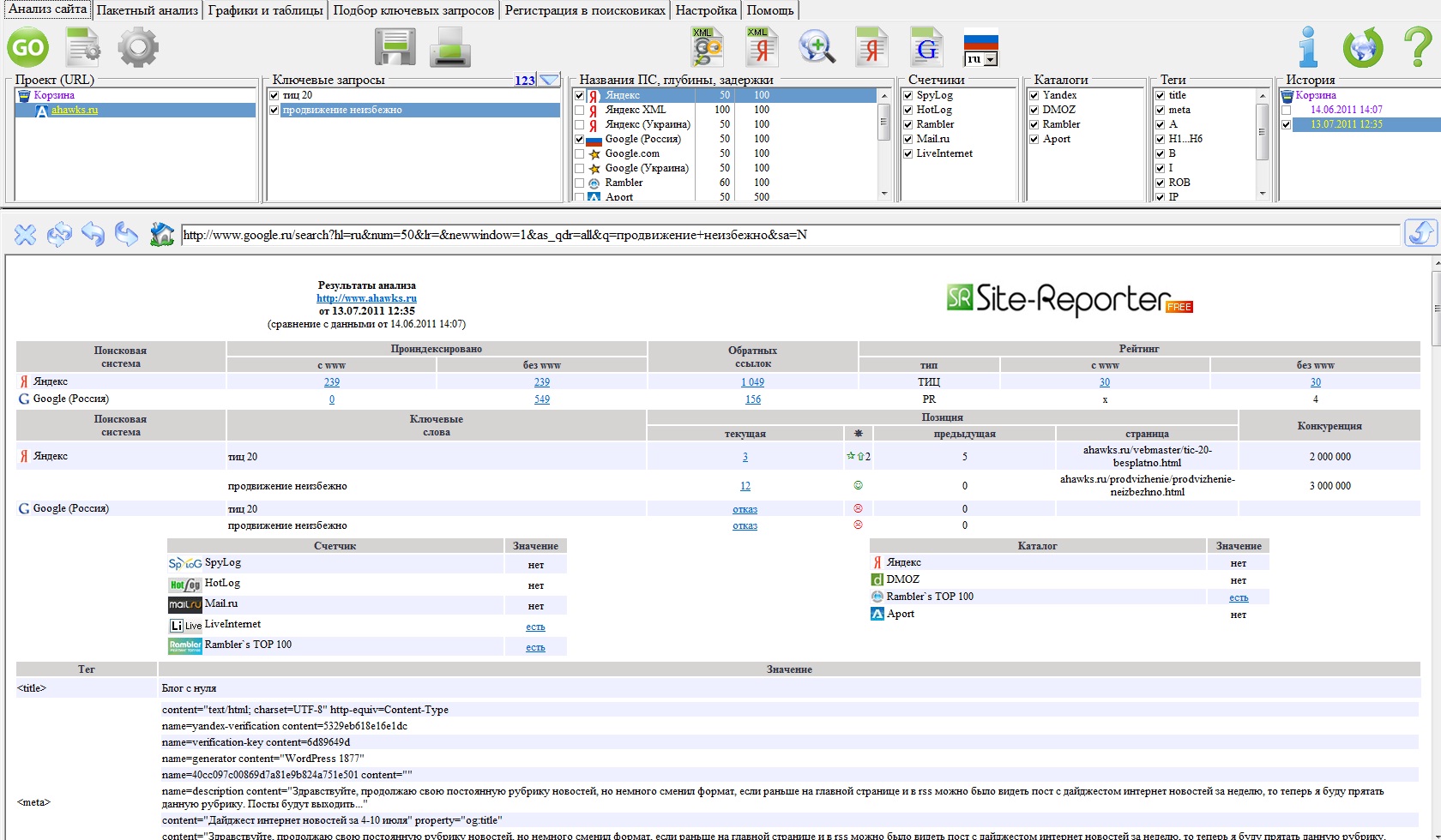 Сильно акцентировать свое внимание на программе не буду, я с ней мало поработал, но, а вы ради интереса можете воспользоваться ею. Скачать её можно бесплатно с официального сайта — site-reporter.ru, жаль, что в этом году она не обновлялась, так что лучше обращать внимание сразу на актуальный софт.