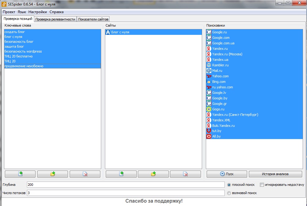 Данная программа SESpider специально и полностью сделана под сегодняшнюю тему, поэтому она обладает большим числом возможностей – 20 поисковых систем для анализа, возможность работать через прокси — сервис, интуитивно понятный интерфейс, возможность задать неограниченное число запросов и сайтов для проверки позиций, указать число потоков поиска и его глубину, результаты проведенной работы хранятся в программе, а так же легко сохраняются в отчеты.