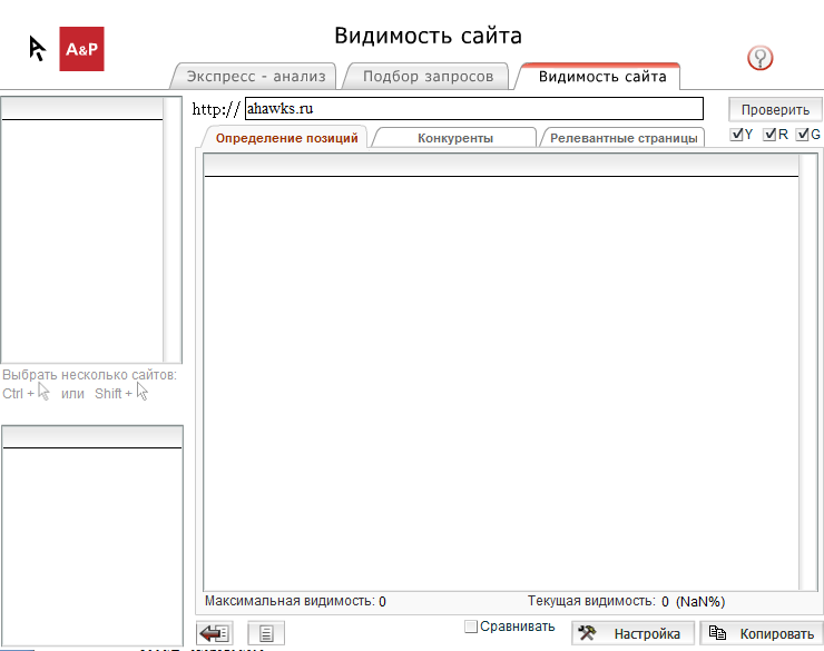 Для запуска программы необходимо выбрать нужные сайты, запросы и поисковые системы, для этого с помощью клика по нужным данным с зажатой клавишей Ctrl выделяйте необходимые объекты для анализа, после необходимо нажать на кнопку «пуск». После анализа вы увидите, на каком месте и в каком поисковике находится ваш запрос и сможете с того же окна сохранить к себе на компьютер отчет.