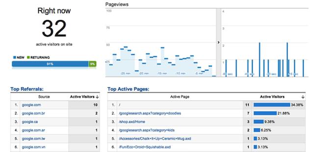 Раньше сервис Google Analytics предоставлял данные с задержкой в сутки, теперь их политика изменилась, и показатели можно просматривать в реальном времени, пока данная функция находится в бета тестирование. С помощью такого отчета можно узнать число активных посетителей на сайте в эту же секунду, по какому запросу пришел пользователь, через какой источник попал на сайт, на какую страницу он попал с запроса, в какой стране и городе он проживает.