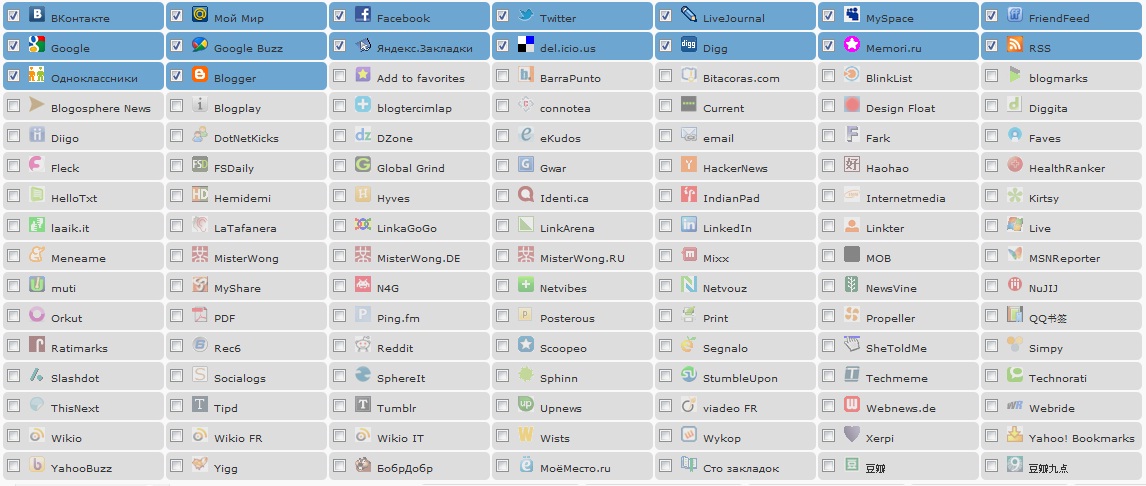 Во первых первоначально включена часть социальных кнопок, часть которых не вписывается в Рунет, поэтому по своему вкусу выберите нужные для Вас социальные кнопки. На рисунке я предоставил полный список предоставляемых программой кнопок и те которые выбрал я.