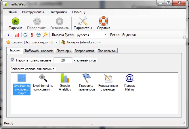 Программа имеет не замысловатый интерфейс, где есть шесть сервисов: экспресс анализ по LI, анализ LI по поисковым фразам, анализ по Google Analytics, проверка параметров, релевантные страницы и парсер mail.ru.