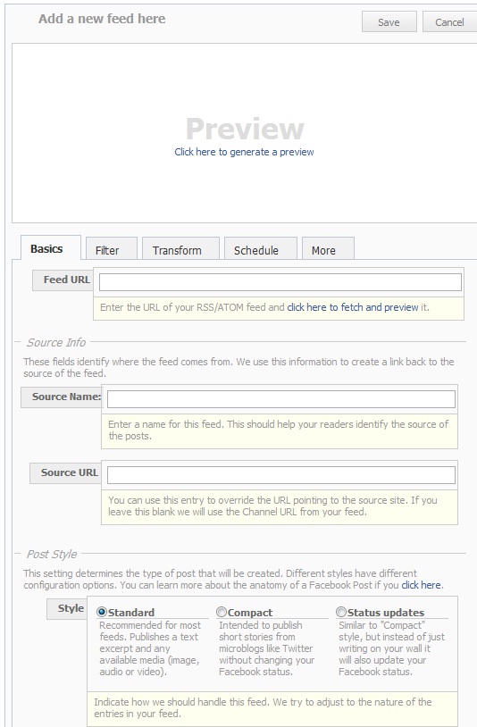После заполнения полей можно выбрать стиль для постинга, но я рекомендую оставить стандартный, после чего вверху приложения кликнуть на “save”, после чего новые публикации будут появляться на вашей странице. Так же с помощью приложения RSS Graffiti можно просматривать количество переходов с анонсов на сам блог.
