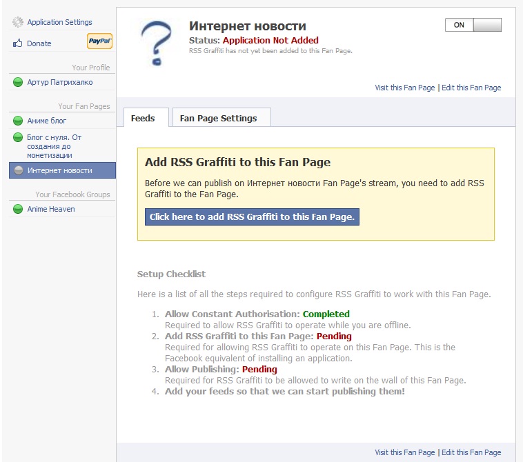 Страница без кросспостинга обозначена серым кружком и при выборе её появляется соответствующее поле, кликаем на «Click here to add RSS Graffiti to this Fan Page», добавляем приложение на вашу страницу, после чего авторизируем приложение на странице. После всех преобразований нажимаем на «Add feed» и в появившемся окне заполняем следующие поля:
