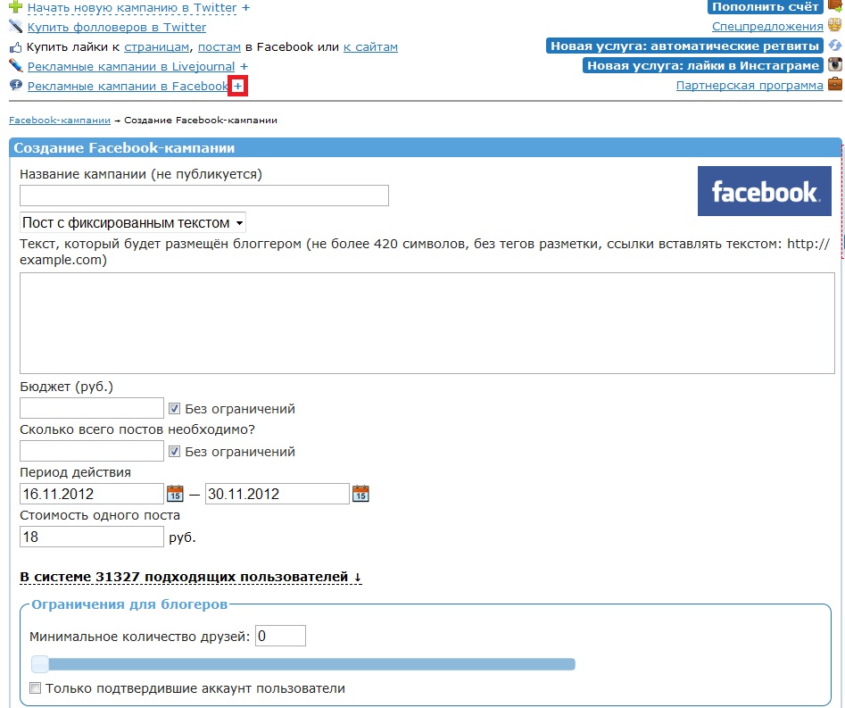 Настройка рекламной компании с размещение специального текста по профилям в фейсбуке простая, вы пишите сам текст, указываете бюджет рекламной компании (можно его вычислить из стоимости одного поста и количества постов которое вы хотите разместить в рамках этой рекламной компании). Главное не забывайте нажать на строчку «В системе № подходящих пользователей ↓», чтобы открылось дополнительное поле фильтра, где можно указать минимальное количество друзей в Фейсбуке (максимально число 5000), а так же указать, чтобы размещалась реклама только у пользователей подтвердивших свой аккаунт. Зачем тратить лишнее на неэффективные профили, когда надо пользоваться средствами с умом.