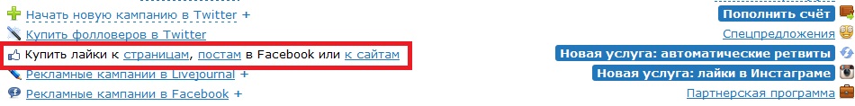 Для покупки лайков необходимо в верхней панели вкладки рекламодатель слева выбрать соответствующий тип лайка, как показано на рисунке и появится нужное вам окно.