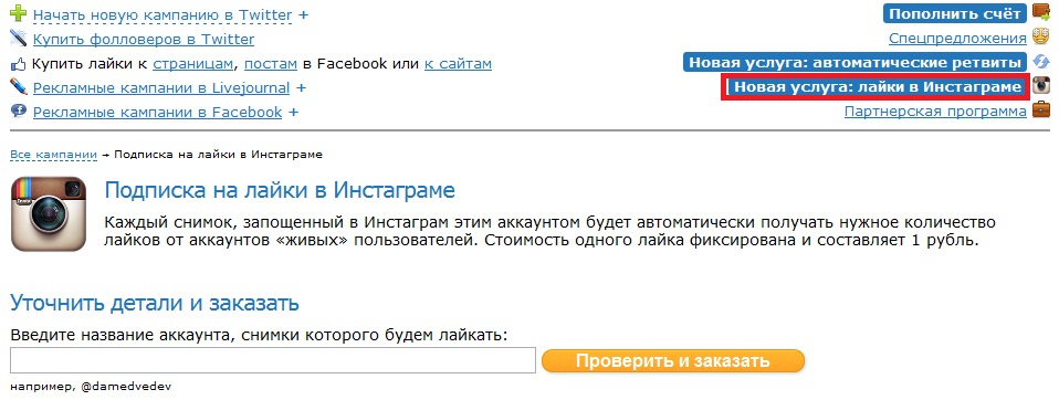Для того, чтобы купить лайки в инстаграм необходимо на странице рекламодателя в правом верхнем углу нажать на «Новая услуга: лайки в Инстаграме» (как показано на рисунке снизу) и снизу появится простое окно, где вы указываете нужный вам аккаунт, после чего выбираете нужное вам количество лайков от 10 до 100.