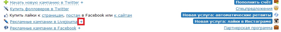 Чтобы начать рекламную компанию в живом журнале необходимо на странице рекламодателя в левом верхнем углу найти в списке услуг «Рекламные кампании в Livejournal» и нажать на значок «плюс», как показано на рисунке.