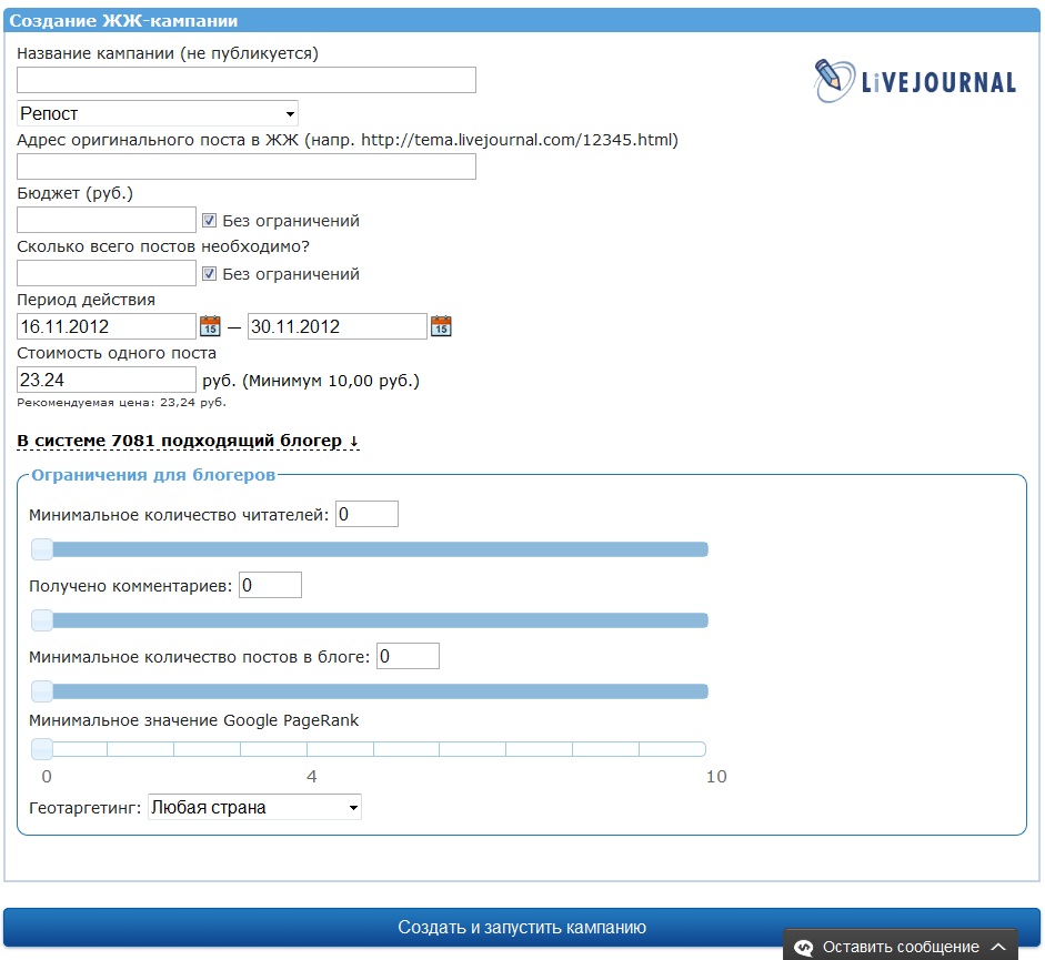 Не забудьте нажать на «В систем № подходящих блогер», чтобы еще более сузить таргетинг, ведь нет смысла размещать рекламу на непосещаемых ресурсах, поэтому установите свои значения для минимального количества читателей, комментариев и постов в ЖЖ, и сама биржа вам автоматически покажет, сколько платформ удовлетворяют ваше требование и ориентировочная цена на размещение поста. Так же если вы собираетесь еще и повысить значение Google PageRank, стоит выбирать блоги с не нулевым показателем, а для трафика будут полезен геотаргетинг по нужной вам русскоговорящей стране.