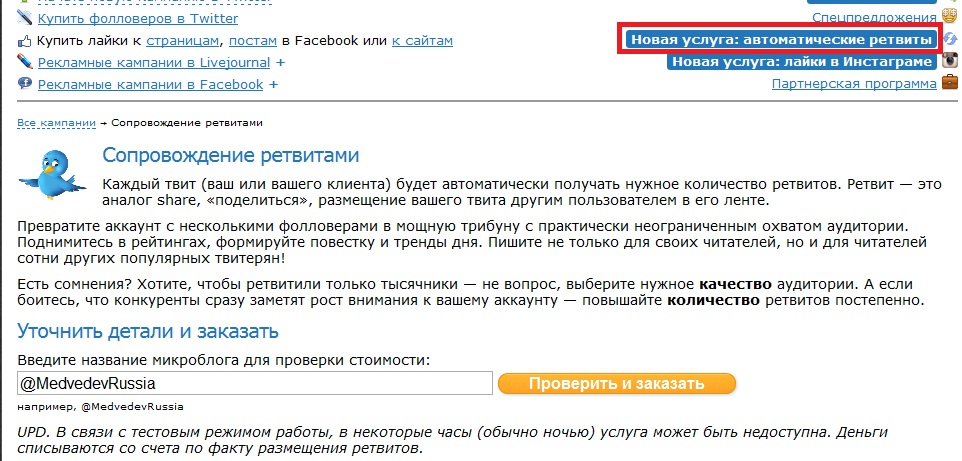 Создание данной рекламной компании по ретвитам позволит вам всегда получать необходимое число ретвитов, расширить охват своей аудитории, вывести в тренд нужный хэштег (при соответствующем бюджете). Для того, чтобы воспользоваться данной услугой на странице рекламодателя выбираем в правом верхнем углу – «Новая услуга: автоматические ретвиты», как показано на рисунке, после чего открывается новое окно.