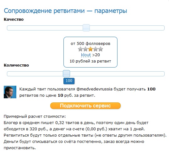 Система автоматически рассчитывает бюджет на 1 день или на число дней, которое может позволить счет в бирже. Бюджет рассчитывается с учетом среднего числа твитов в день * количества ретвитов (от 10 до 250 в день) * качество аккаунтов, которые будут ретвитеть (от 1 до 4 звезд акки можно выбирать). Данная услуга распространяется только на написанные пользователем посты, без учетов ответа на другие твиты.