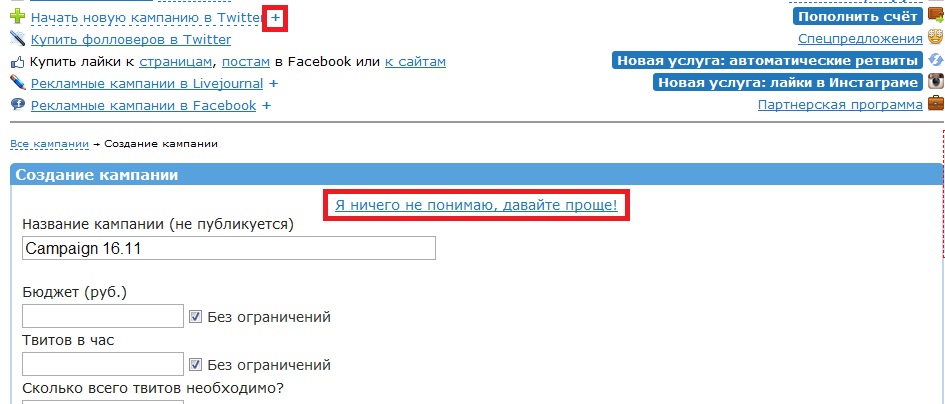 При создании рекламной компании в твиттере есть несколько вариантов в её настройки – простой и расширенный. Если вы не хотите разбираться в настройках рекламы, тогда нажмите на «Я ничего не понимаю, давайте проще!» и перед вами появится простое окно, в котором вы можете указать только сам текст твита и выбрать ценовое решение размещение твита (дёшево, как у всех и быстро).