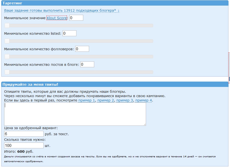 С помощью таргетинга можно в ручном порядке указать минимальный порог для аккаунтов по количеству фолловеров, числу твитов, количеству listed и рейтингу. А если вы хотите разнообразить свою рекламную компанию, но у вас исчерпалась фантазия на тексты для твитов, тогда можно заказать создание рекламных текстов, а вы уже сами выберете, подойдут они вам или отказаться от них.
