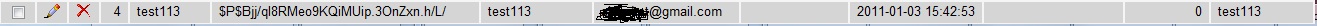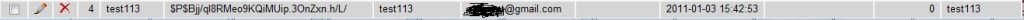 Когда вошли, выбираете нужную Вам базу, а затем смотрите на нужную нам базу в левом сайтбаре. Если Вы не изменяли префикс БД, то список БД будет выглядеть как на рисунке. Из списка выбираем wp_user и кликаем на ней. Открывается страница с зарегистрированными или созданными пользователе на Вашем сайте. Для эксперимента я создал нового пользователя с логином test113, данную запись Вы сможете просмотреть на рисунке, выбираем нужного нам пользователя и нажимаем на значок «карандаша» в нужной строке.