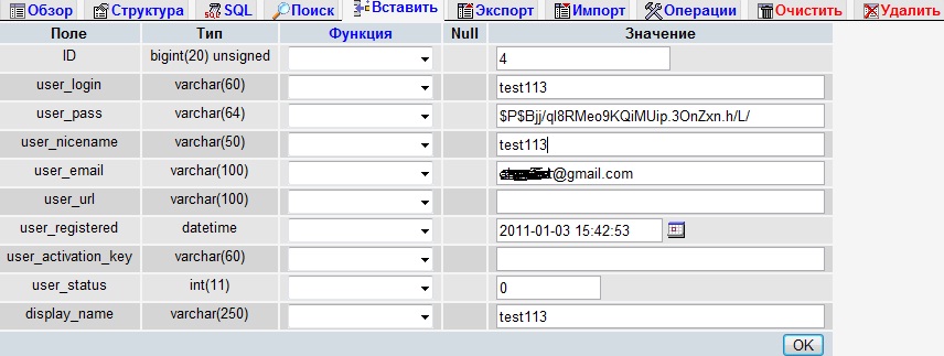 Откроется поле как изображено на рисунке. В данной форме можно изменить любой из параметров, который есть в данной таблице: логин, дату регистрации, пароль, имя для отображения на блоге, мыло, сайт. После нужного изменения нажимаем на ок и все в порядке. Так мне один раз пришлось изменять пароль через БД из-за ошибки в одном скрипте.
