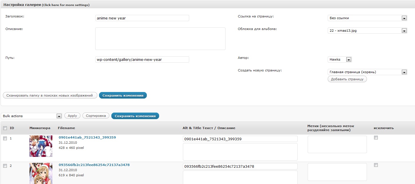 Сделанная галерея на блоге можно с помощью плагина wordpress NextGEN Gallery может отображаться в двух режимах: в режиме слайд шоу, когда по клике на большую картинку происходит переход на следующую, так и в режиме списка с отображением миниатюр рисунков. Пример использования данного плагина можно посмотреть на моем втором аниме блоге – «новогодние аниме картинки».