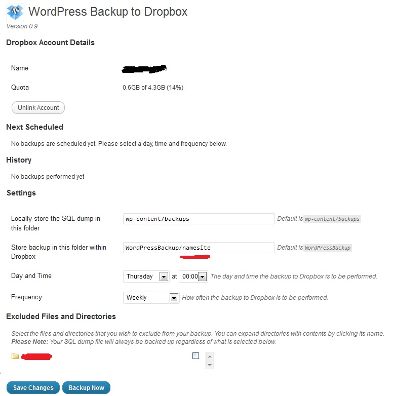 Возвращаемся опять к настройкам плагина и видим следующие возможности: отображение занятого места в облаке, Next Scheduled (когда в следующий раз произойдет резервирования сайта), история бэкапов (когда прошли бэкапы, успешно или с ошибками и какими), в группе настройки можно задать место, где на хостинге и сервисе дропбокс будут храниться копии сайта, а так же можно задать время, когда делать резервную копию блога.