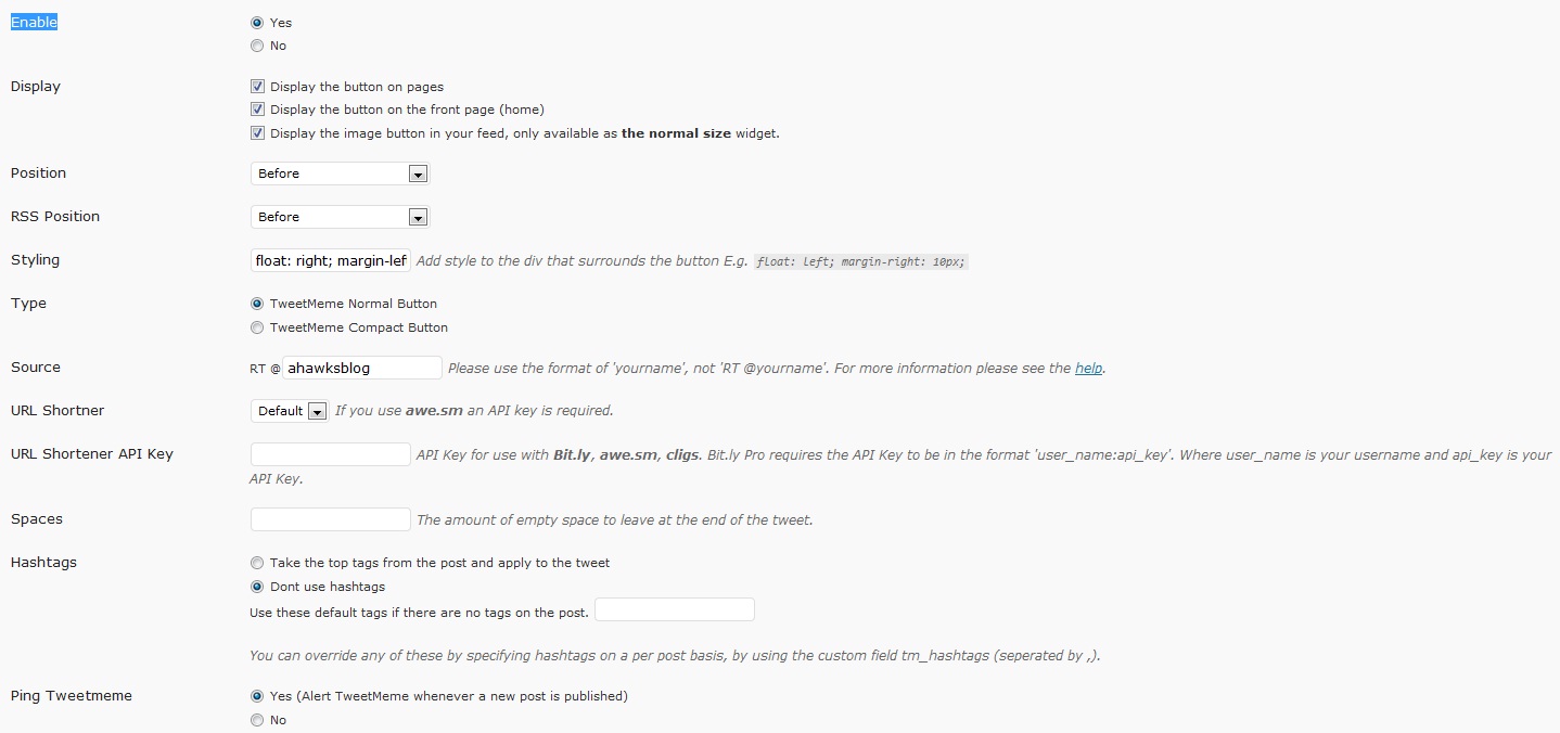 На многих блогах если установлена синяя кнопка ретвита, то при ретвите сообщения отображается только ссылка на пост и автор, и не отображается название поста, поэтому я рекомендую устанавливать зеленую версию кнопки. Для этого в настройках плагина в панели твиттер выставляем Enable no, а в панели Tweetmeme — Enable yes.