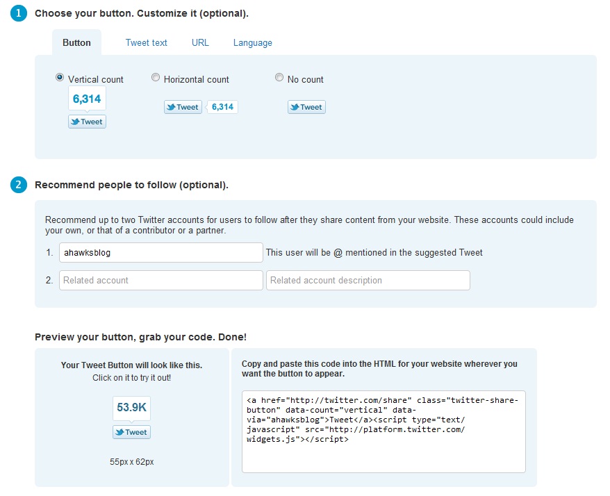 После того как я вам предложил два плагина для установки твиттер кнопки retweet на блоге, я рекомендую ознакомиться с более легким вариантом установки кнопки для вашего блога, это добавления кнопки твиттер ретвита через код в нужном вам месте. Для этого заходим на официальный сайт твиттера и попадаем в небольшой конструктор твиттер кнопки.