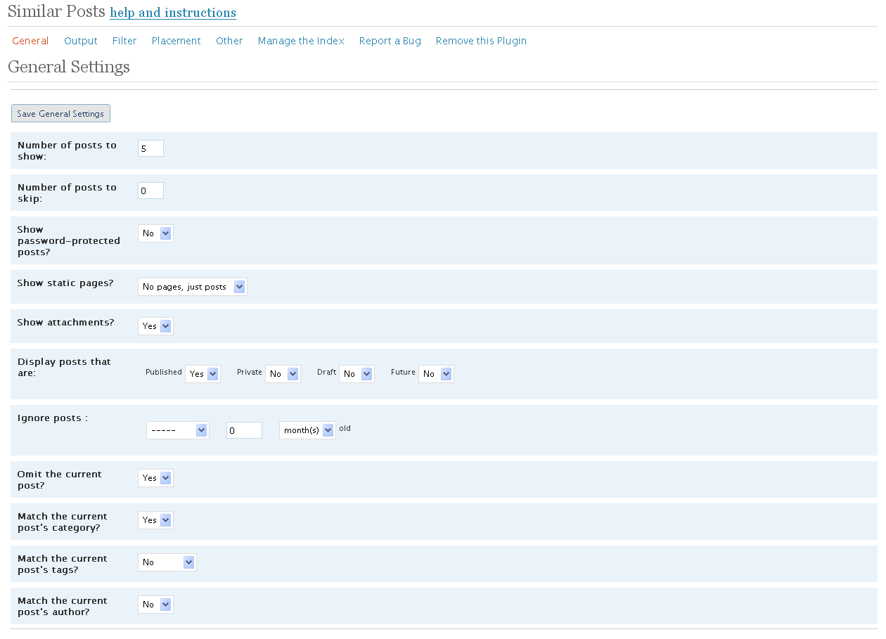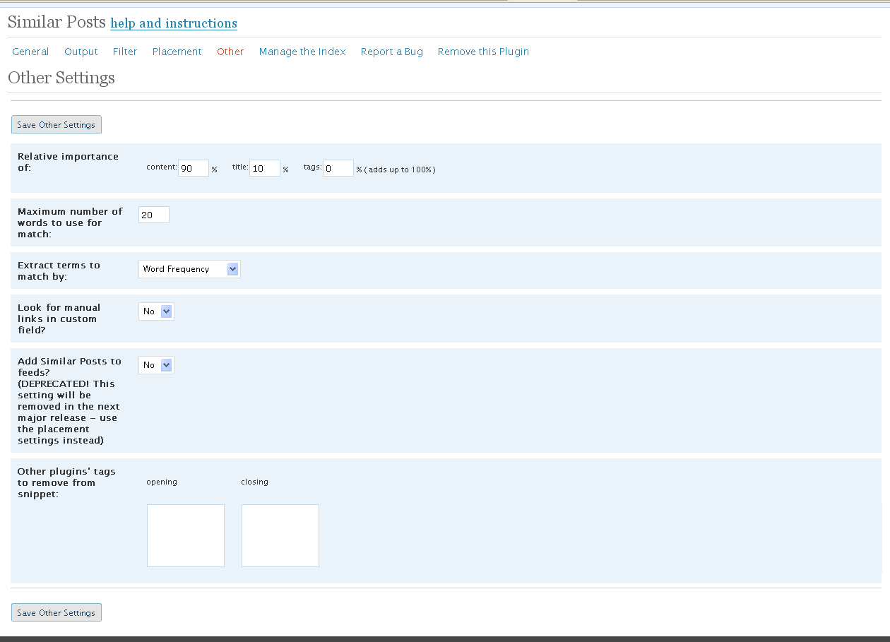В настройках плагина можно выставить исключения и другие мелкие изменения. Особенное внимание хочу уделить пункту «критерий схожести», если у вас много постов выставьте коэффициент 2, если мало ставьте 5 или поэкспериментируйте сами с этим значением.