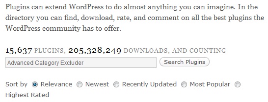 На сайте wordpress.org/extend/plugins/ при помощи панели поиска можно найти любой нужный вам плагин, после чего узнать сколько раз его скачивали, с какими версиями он совместим, как правильно устанавливать, посмотреть его скриншоты, задать вопрос по плагину и многое другое. К примеру, мне надо найти плагин Advanced Category Excluder для скрытия статей в рубриках, для этого в поле поиска я вбиваю его название и нажимаю кнопку поиск.