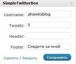 После этого во вкладке «Внешний вид» выбираем «виджиты». Теперь перетаскиваем виджет «SimpleTwitterBox» в нужное место в сайтбаре сайта. При добавление виджета появляется небольшое меню настроек (смотри рисунок), где необходимо в верхнем поле указать Ваш логин с twitterа в моем случае это ahawksblog. Ниже указывается количество сообщений с твиттера для отображение на блоге.