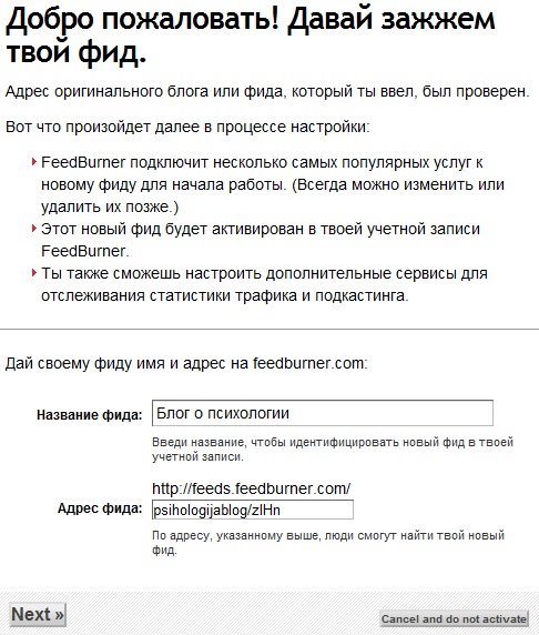 Появилось новое окно, где можно будет назвать ваш фид рсс ленты и присвоить ленте свой адрес общем каталоге сервиса feedburner. Если заданный вами адрес ленты будет занят, вас попросят еще раз задать адрес, после успешной попытки добавления RSS ленты предложат её немного оформить.