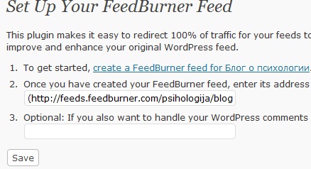 Для этого нам надо установить плагин FeedBurner FeedSmith на наш блог, самый быстрый способ решения данной задачи, это зайти в административную панель – плагины – добавить новый плагин, вписать название FeedBurner FeedSmith – поиск – установить – активировать. Теперь в админке во вкладке настройки ищем FeedBurner и в первой строчке прописываем адрес фида, который мы указывали еще в самом начали, на изображении допущена ошибка вначале я случайно поставил скобку.